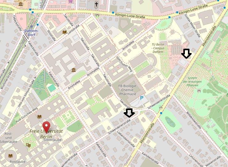 Nearest metro station: U3 Berlin-Dahlem | Nearest bus station: 101, Hans-Söhnker-Platz | Nearest S-Bahn station: S1 Botanischer Garten + 15 min walk | Connection from Berlin Central Station (Hauptbahnhof): S5 to Savignyplatz, bus 101 from Kantstr./Leibnitzstr. to Hans-Söhnker-Platz